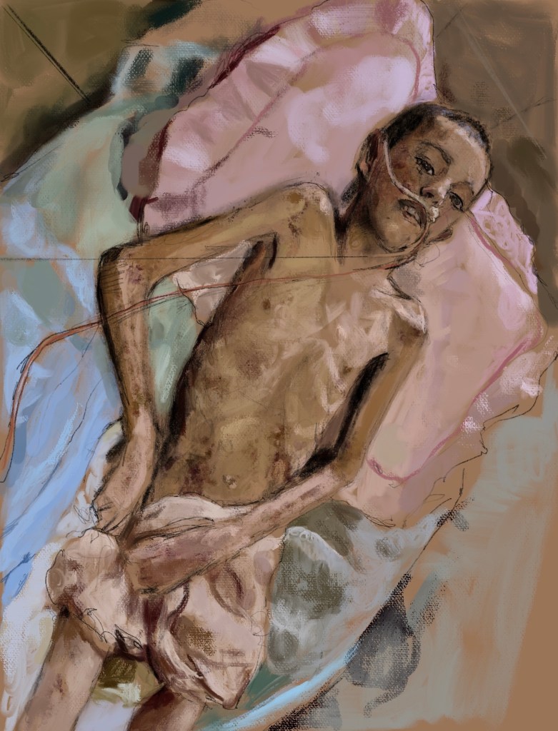 Sketch via eyewitness photo. تصوير عمرو طبشThis is Obaida al Qarra. He was paralyzed from his neck down after shrapnel from an #IDF projectile pierced his skull.His sight/hearing are gone, his immune system destroyed, and he is starving and w/o medicine due to #Israel blockades