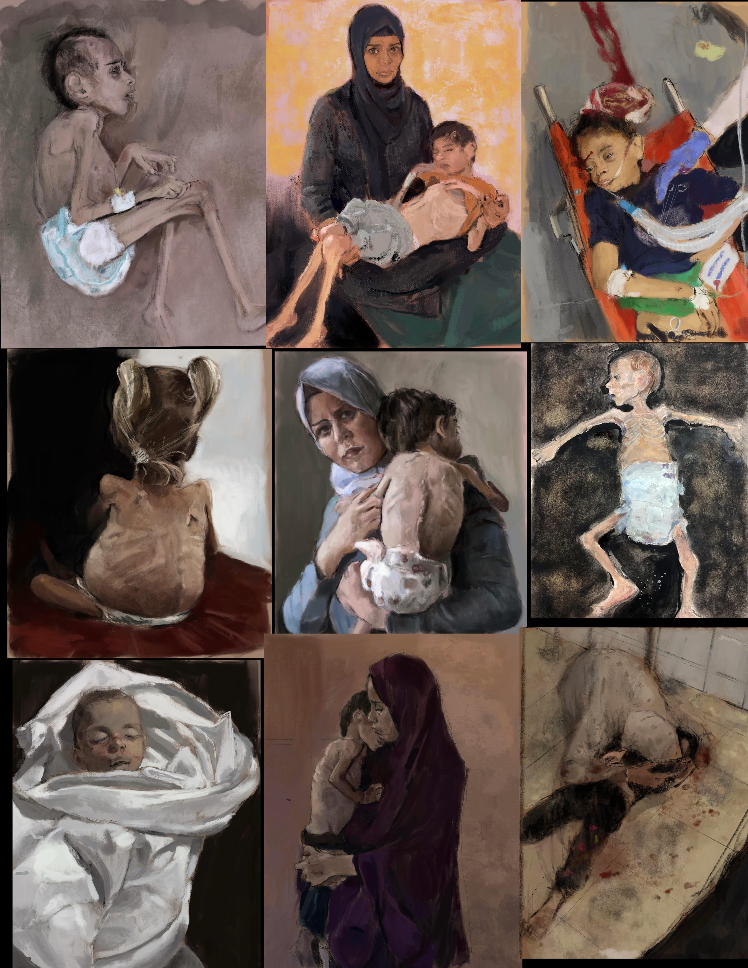 Sketches from eyewitness photos/videos.If you are seeing these images of genocide pouring out of #Gaza ,screaming from your screens, then you are a witness. You have a duty to say something, write something, make something, that makes these crimes impossible to ignore