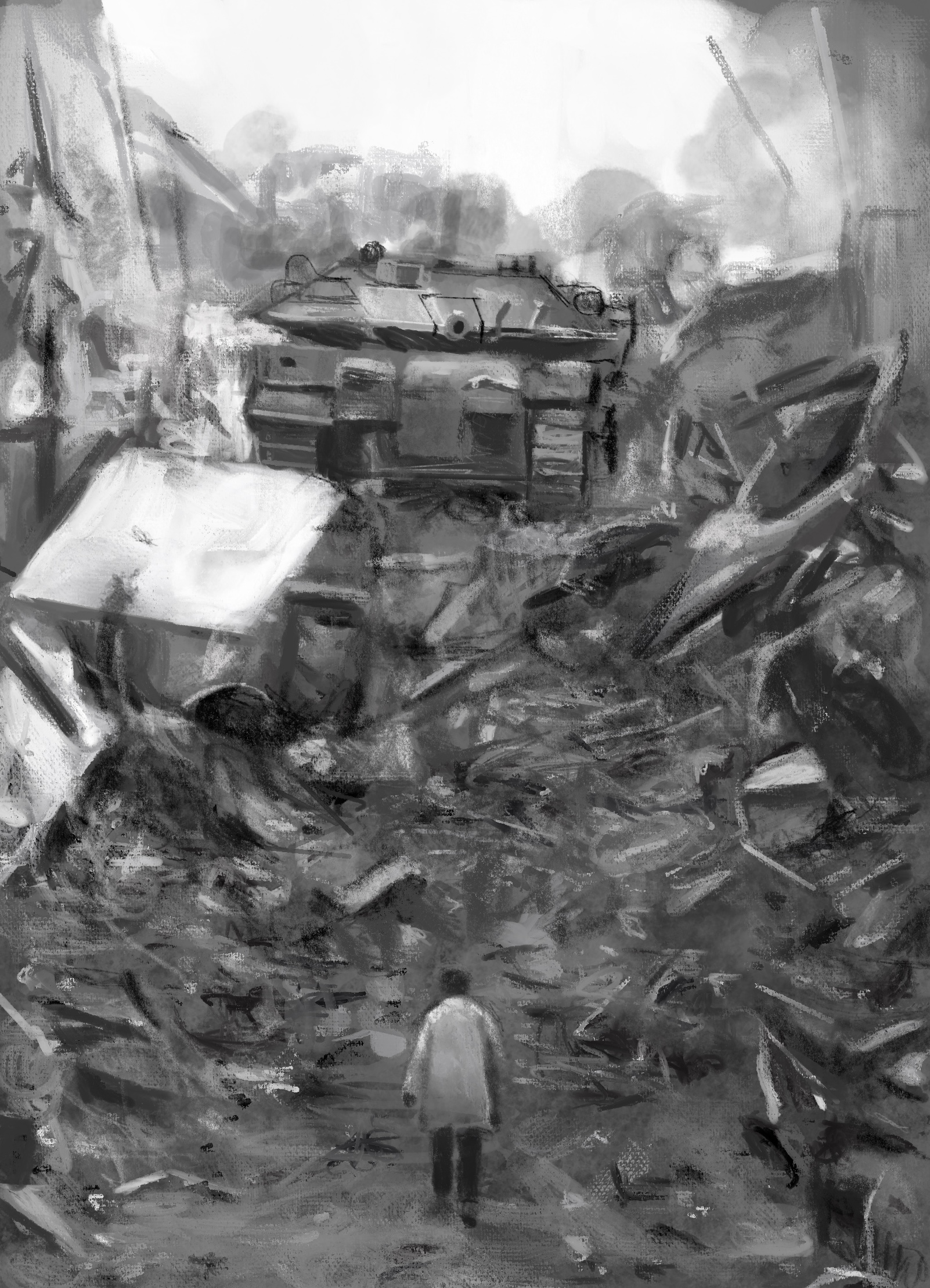 Sketch from eyewitness photo.Almost a year ago, Dr. Abu Safiya, a #Palestinian doctor and hospital director, faced an #IDF tank across a torn #Gaza street. Dr. Abu refused to abandon his patients until everyone was evacuated.Dr. Abu is still in an #Israeli prison.328 days