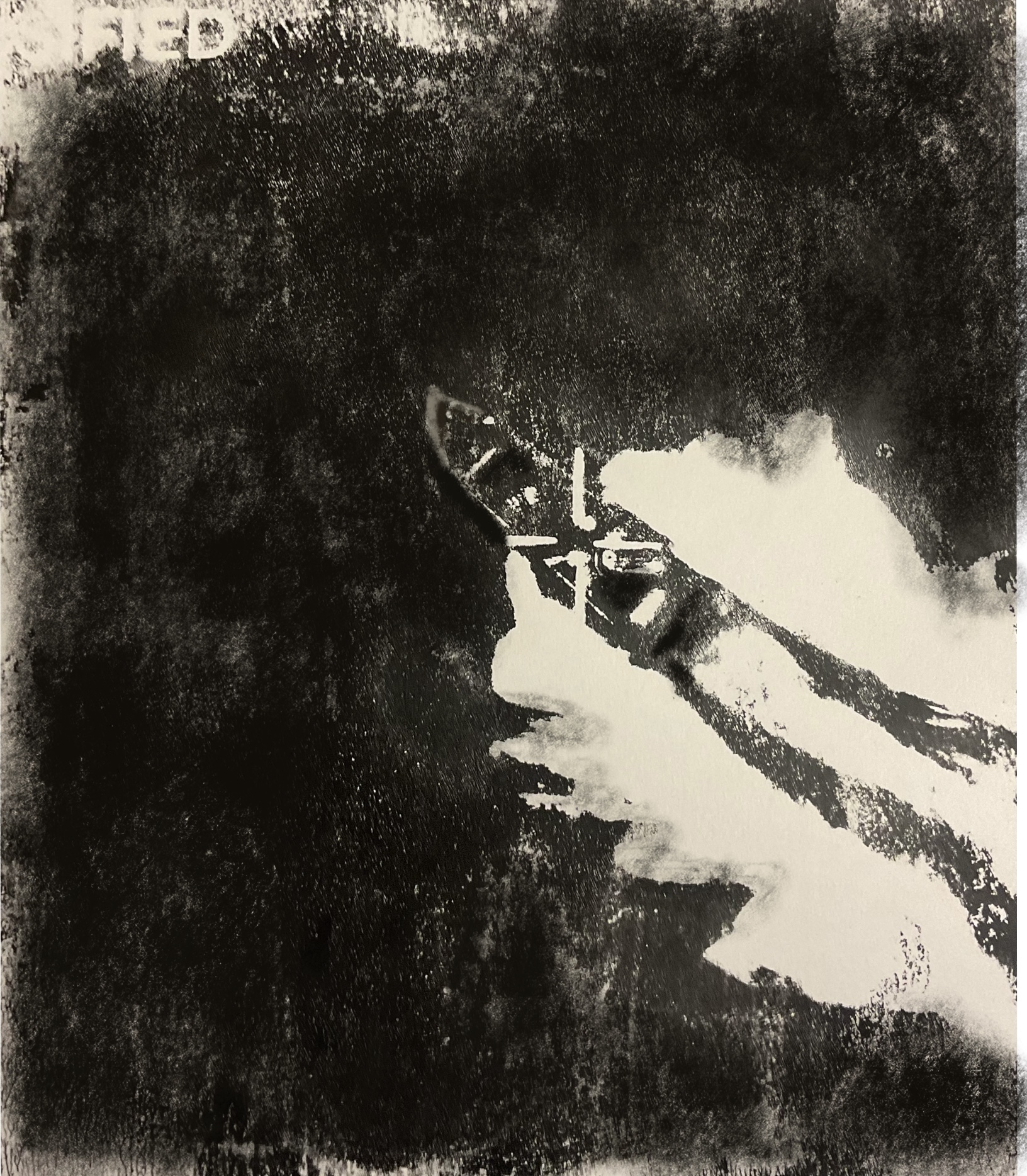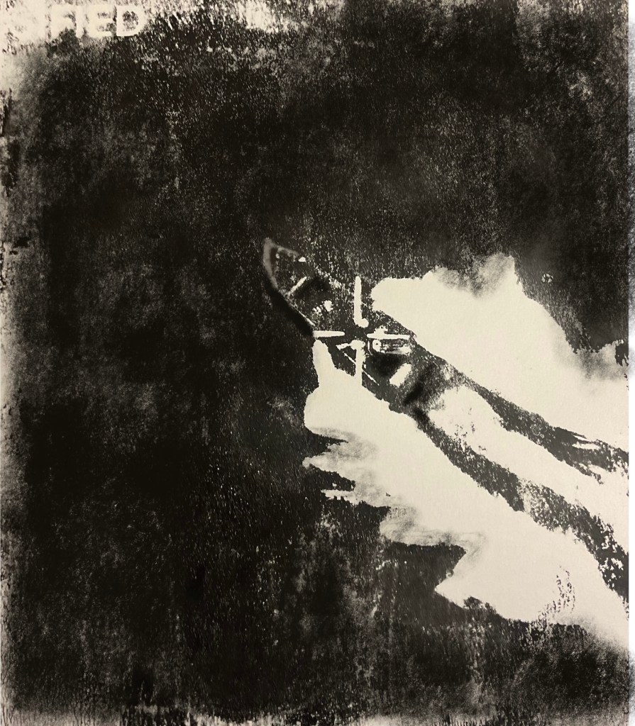 Monotype from video.‘Ghost Print: 9/19/2025’(‘ghost prints’ are the second print from the same plate)The second known extrajudicial murder of three individuals on a boat in the #Caribbean . The #Trump regime is committing #WarCrimes .We all see it.Don’t be silent.