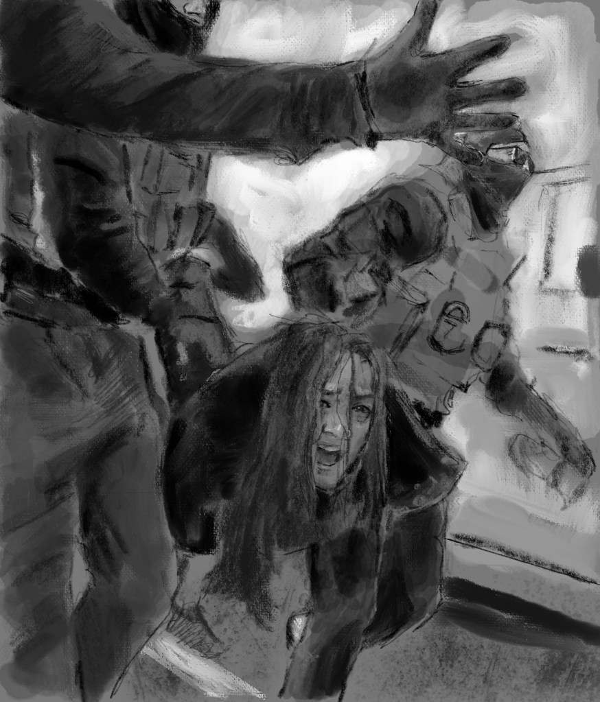 Sketch from eyewitness photo (@reuters )A disabled woman, trying to get to a dr. appointment, is brutally torn from her vehicle, thrown to the ground, and dragged away by #ICE Gestapo in #minneapolis MN.The Trump regime is a bumbling, vile, evil, sludge of evil.If we do not COME TOGETHER and ACT, we will lose our country.