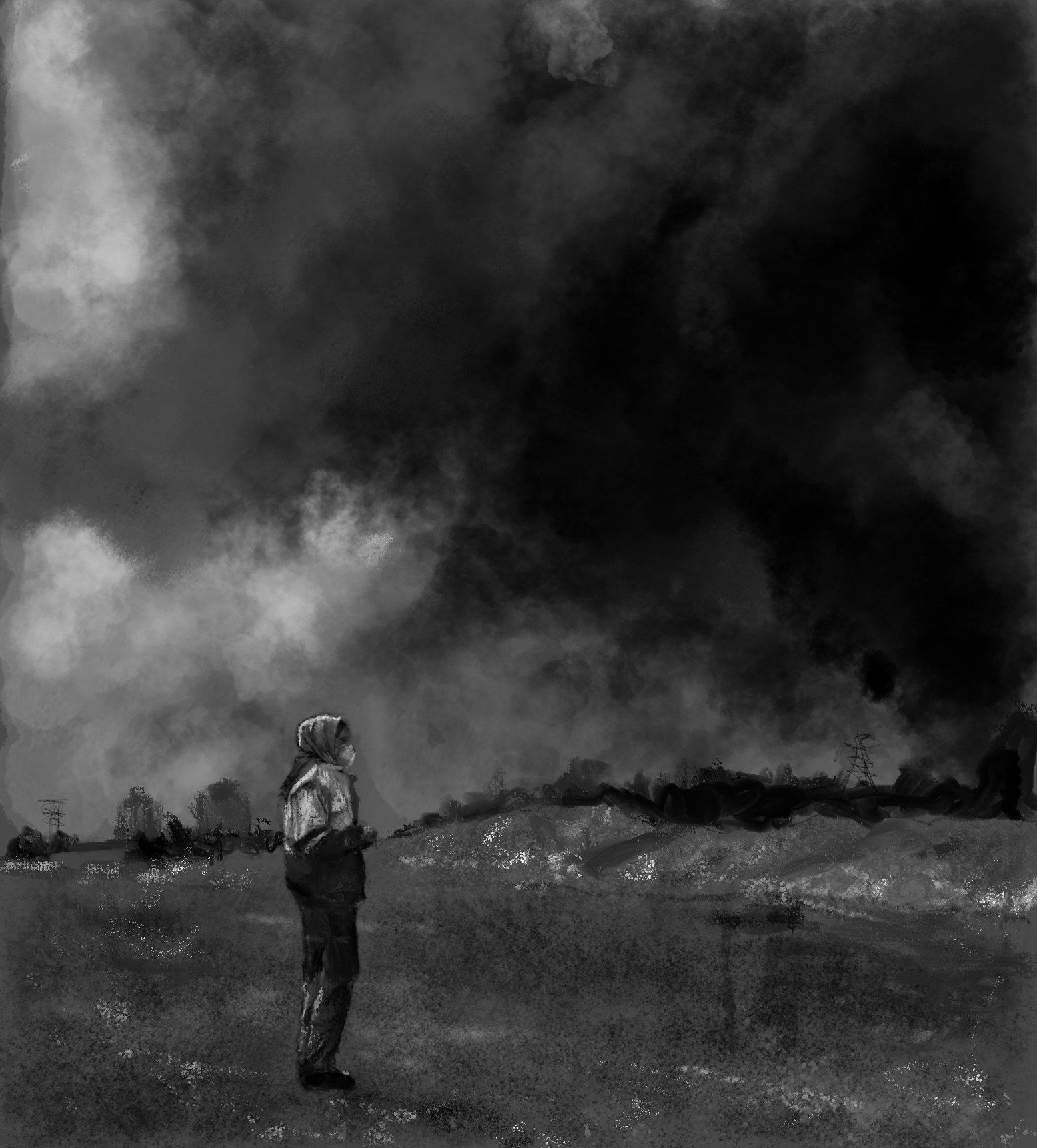 Sketch from eyewitness photo (Arash Khamooshi /The New York Times). Plumes of noxious smoke from Iran’s destroyed oil refineries, saturate the sky and rain poison on civilians.Trump/Netanyahu ‘s illegal war has absolutely devastated the very people they lie about ‘liberating’. This is CHEMICAL WARFARE!