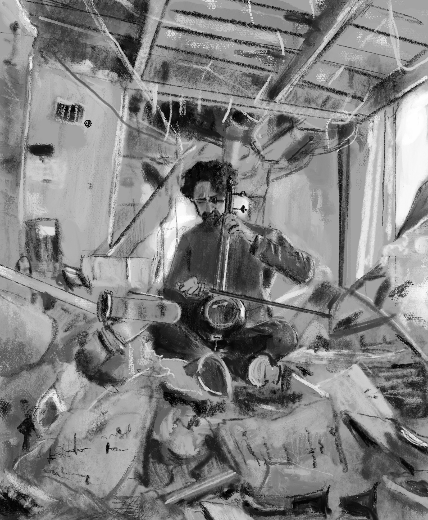 Sketch from eyewitness video.Music teacher Hamidreza Afrideh plays the kamancheh, an ancient Persian fiddle, in the ruins of his music school (Honiyak Music Academy, Tehran, Iran). The school was destroyed by U.S./Israeli attacks. When Trump threatens to commit genocide against an ‘entire civilization’ he threatens compassionate souls like Hamidreza and his students.Trump is one of history’s monsters.